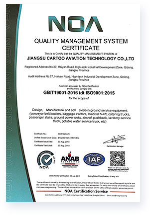 目前公司產(chǎn)品已覆蓋機(jī)場(chǎng)包括飛機(jī)服務(wù)、行李貨運(yùn)地面服務(wù)、航空旅客服務(wù)以及新能源機(jī)場(chǎng)服務(wù)等適用領(lǐng)域,并可按用戶要求提供各類定制產(chǎn)品的設(shè)計(jì)和生產(chǎn)服務(wù)。公司所有產(chǎn)品設(shè)計(jì)和生產(chǎn)滿足國際民航組織(IATA)和中國民航總局(CAAC)設(shè)備技術(shù)要求,工廠生產(chǎn)流程嚴(yán)格按照ISO質(zhì)量管理體系,于2018年8月成功通過了質(zhì)量體系ISO9001:2015認(rèn)證。